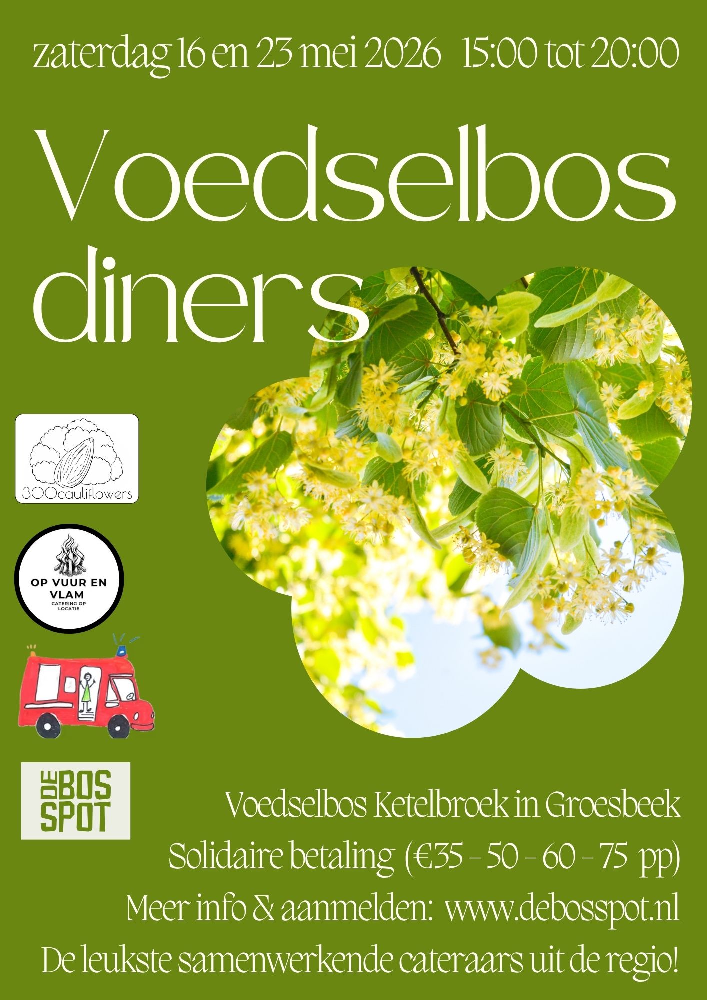 Op zaterdag 23 mei organiseren Op Vuur en Vlam, De Rode Comcommer, 300 Cauliflowers en De Bosspot een uniek luxe diner in het prachtige voedselbos van Wouter van Eck en Pieter Jansen: Ketelbroek. We slaan de handen ineen om jullie als gasten niet alleen het lekkerste uit het seizoen voor te schotelen, maar ook de volledige belevenis te geven van wat een volwassen voedselbos ons te bieden heeft. In de lente is er al genoeg te oogsten; veel interessante aangeplante soorten, maar ook veel inheemse wilde planten bieden ons volop hun smaken aan.