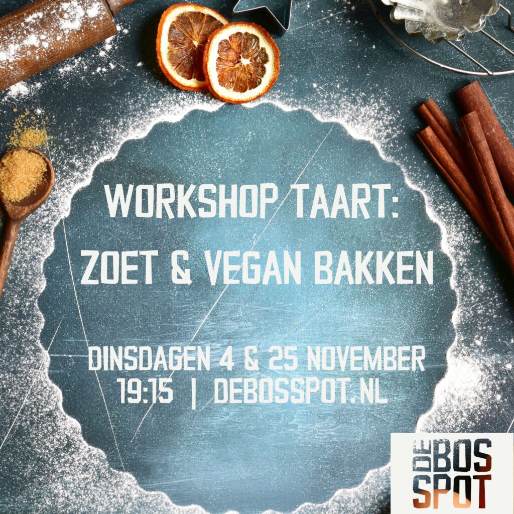 dinsdag 18 november 19:30u: Fermenteren – voldinsdag 25 november 19:15u: Taart; Zoet & Vegan Bakken – voldinsdag 2 december 18:30u: Vegan Feestdagen – inclusief diner! – vol- maandag 15 december 19.15u: Tofu maken